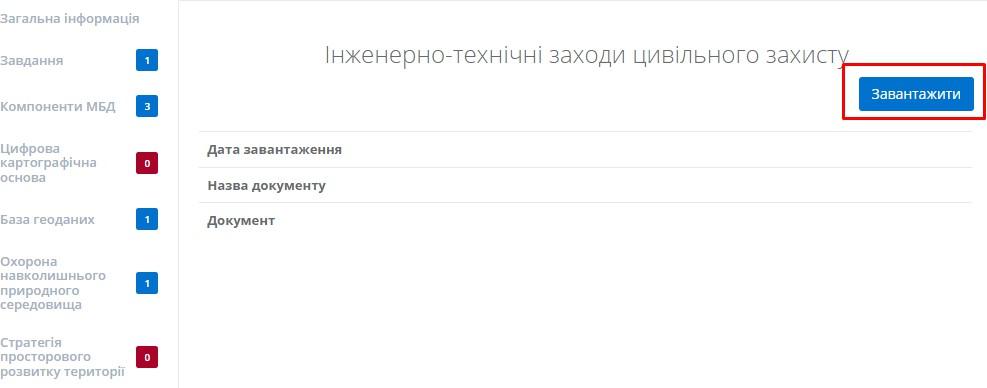 Вкладка містить відомості про розділ Інженерно-технічні заходи цивільного захисту проекту МБД (Рисунок 42) який необхідно додати, натиснувши кнопку “Завантажити”: