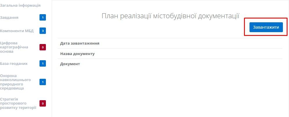 Вкладка містить відомості про розділ Плану реалізації містобудівної документації проекту МБД (Рисунок 45) який необхідно додати, натиснувши кнопку “Завантажити”: