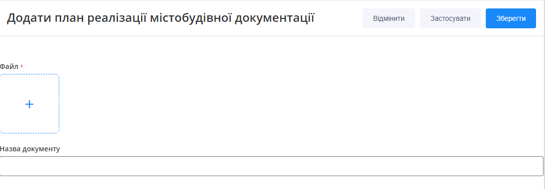 Для додання нового проекту МБД користувачу необхідно натиснути на кнопку , яка знаходиться у верхній частині реєстру. Після чого користувачу відкриється форма додавання нового документу (Рисунок 23):