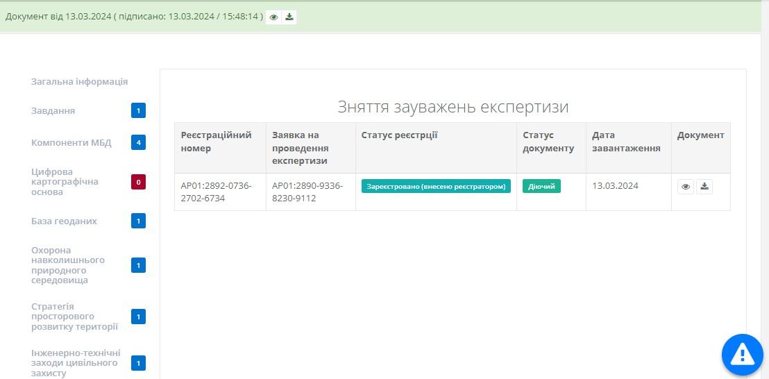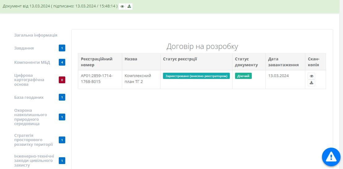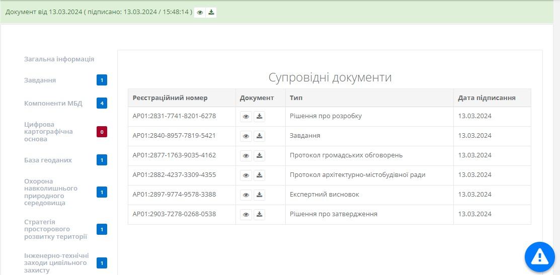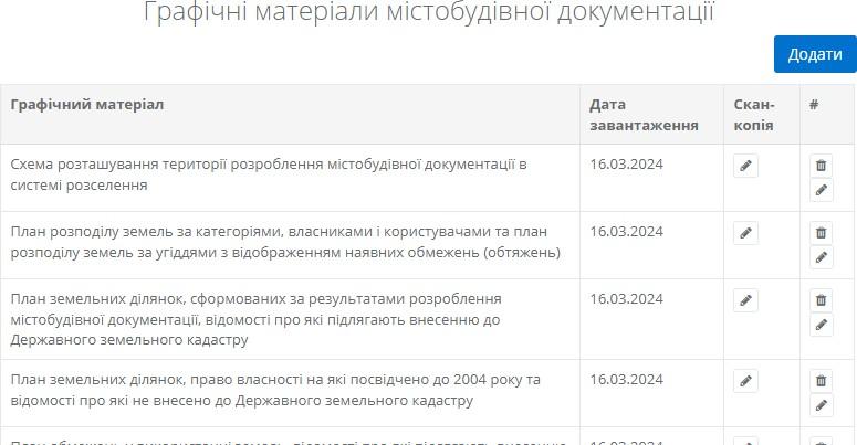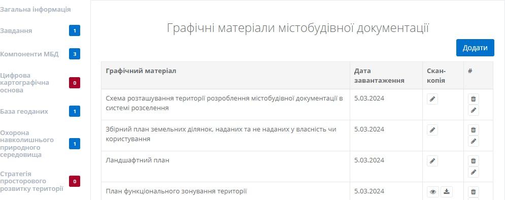За потреби користувач може редагувати внесені відомості, натиснувши кнопку , переглянути або завантажити матеріали плану реалізації містобудівної документації натиснувши на відповідні кнопки