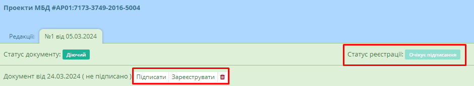 Після цього документ отримає статус “Очікує підписання” та водночас користувачу стануть доступні кнопки підписання та реєстрації документу (Рисунок 62):