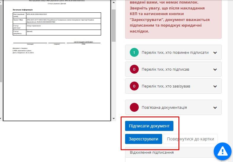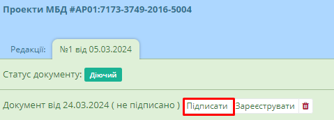 Для підписання та реєстрації проекту, користувачу необхідно підтвердити внесені відомості, натиснувши кнопку з назвою документу (Рисунок 60). Важливо, що проект МБД перед реєстрацією в системі також має підписати Замовник власним КЕП.