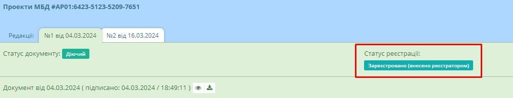 кнопку , яка знаходиться у верхній частині форми. Після чого новий проект МБД буде додано до реєстру зі статусом “Чернетка”.