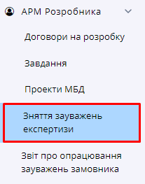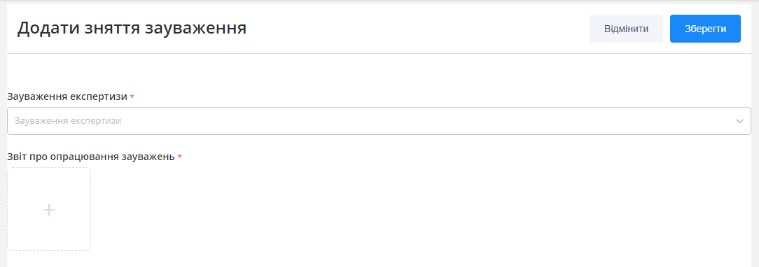 В формі користувач має вибрати з випадаючого списку зауваження експертизи по їх реєстраційному номеру, до якої надаються відомості про їх зняття, та завантажити файл цього документу.