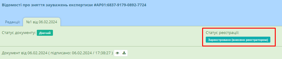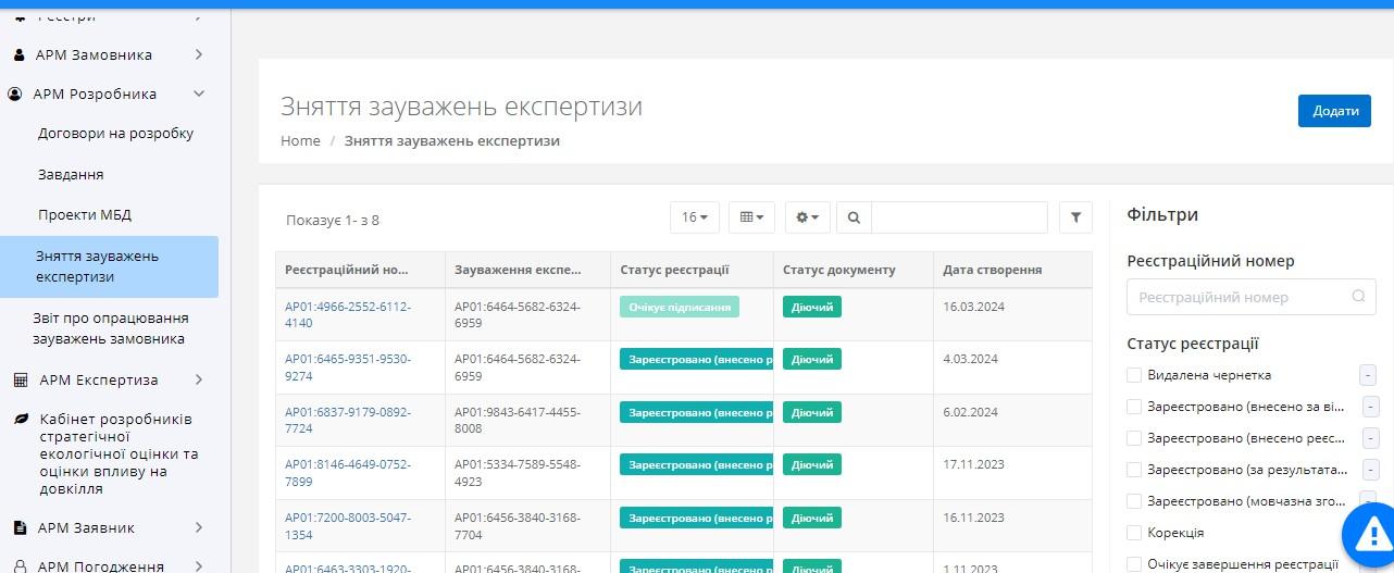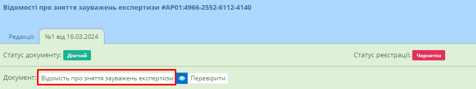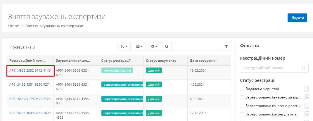 Після створення документу та натиснення кнопки “Зберегти”, система автоматично перемістить користувача в реєстр зняття зауважень експертизи. Знайшовши необхідний документ, користувач має перейти до його картки.