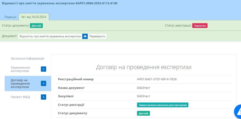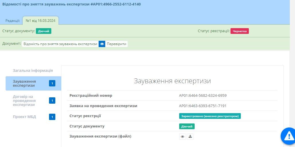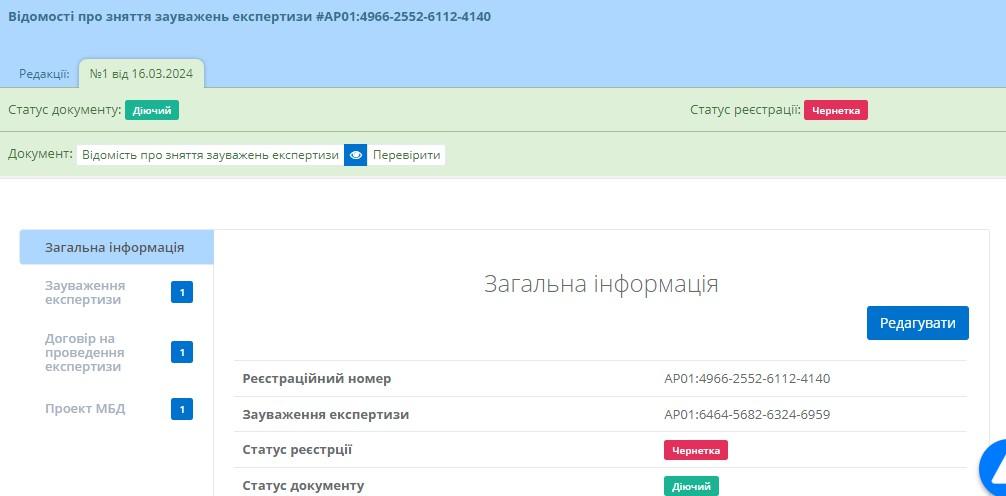 Вкладка яка містить загальну інформацію про зняття зауважень експертизи. Загальну інформацію також можна редагувати натиснувши на однойменну кнопку у верхній частині картки.