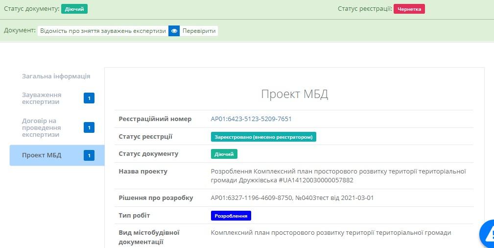 За потреби користувач може перейти до картки проекту МБД, натиснувши на його реєстраційний номер який виділений синім кольором.