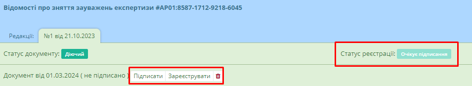 Після цього документ отримає статус “Очікує підписання” та водночас користувачу стануть доступні кнопки підписання та реєстрації документу (Рисунок 79):