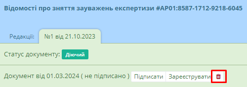 Для видалення дії, користувачу необхідно натиснути на кнопку вилучення, яка знаходиться у верхній частині картки (Рисунок 80)