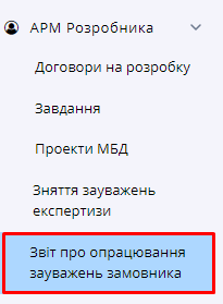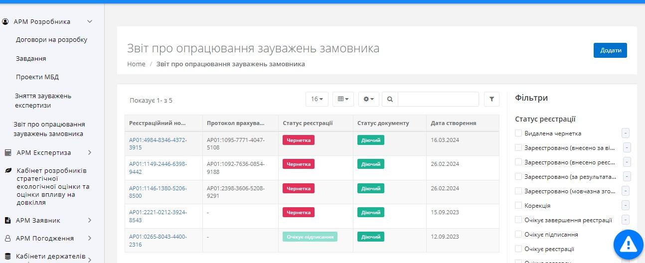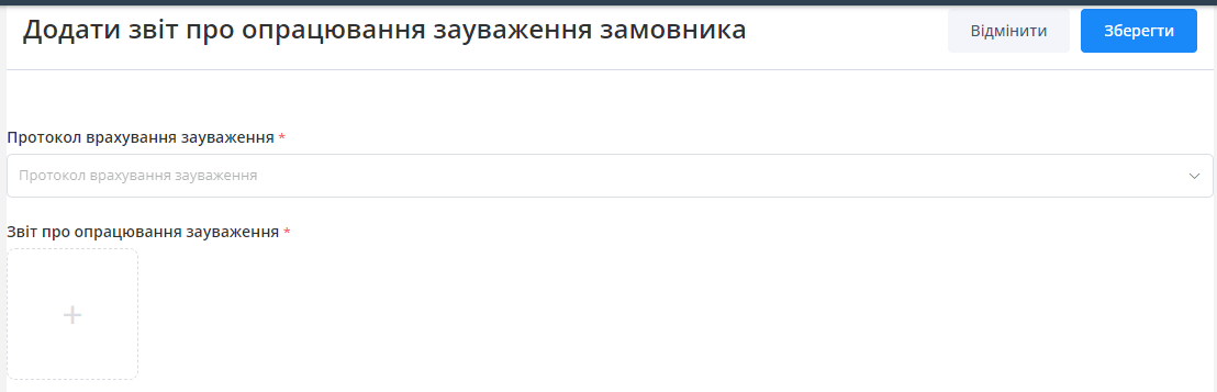 Для додавання звіту про опрацювання зауважень замовника, користувачу кабінету необхідно натиснути на кнопку
