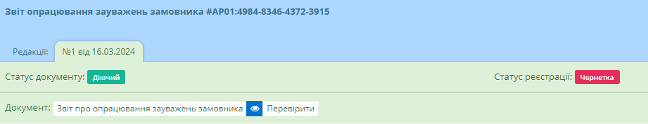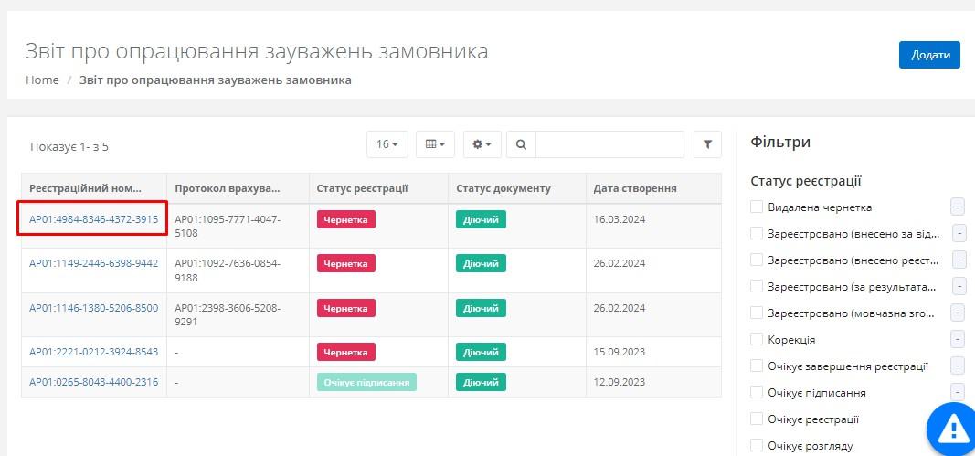 Після створення документу та натиснення кнопки “Зберегти”, система автоматично перемістить користувача в реєстр звітів про опрацювання зауважень замовника. Знайшовши необхідний документ, користувач має перейти до його картки.