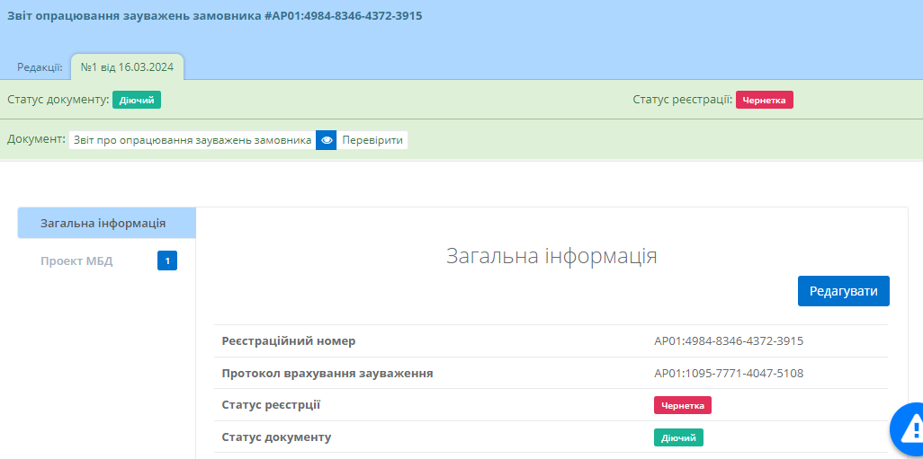 Вкладка яка містить загальну інформацію щодо звіту про опрацювання зауважень замовника. Загальну інформацію також можна редагувати натиснувши на однойменну кнопку у верхній частині картки.