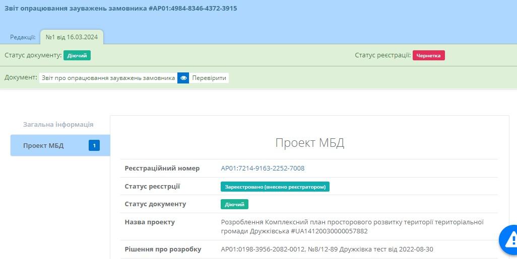 За потреби користувач може перейти до картки проекту МБД, натиснувши на його реєстраційний номер який виділений синім кольором.