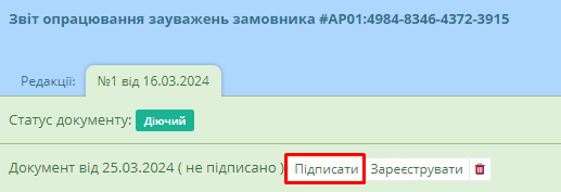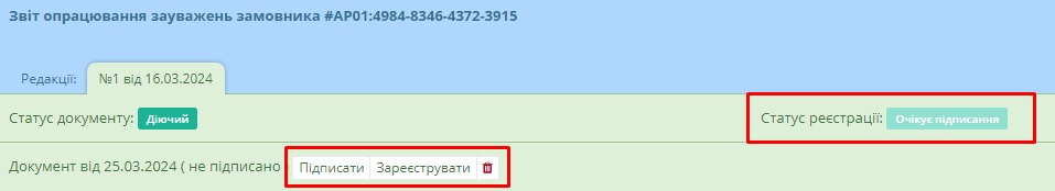 Після цього документ отримає статус “Очікує підписання” та водночас користувачу стануть доступні кнопки підписання та реєстрації документу (Рисунок 94):