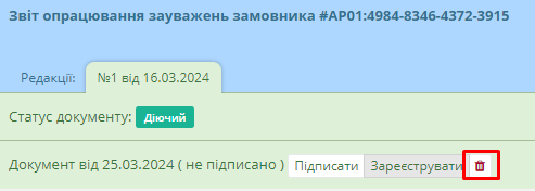Для видалення дії, користувачу необхідно натиснути на кнопку вилучення, яка знаходиться у верхній частині картки (Рисунок 95)