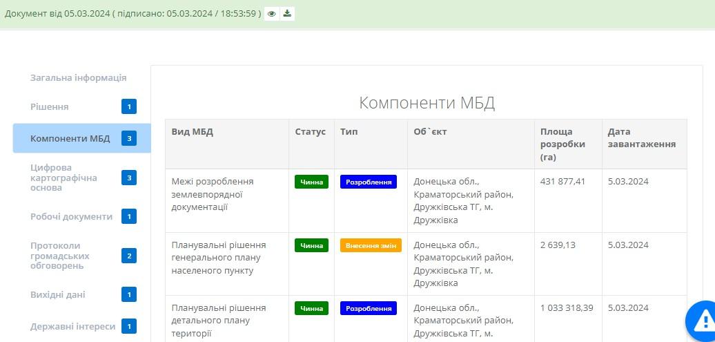 Містить список компонентів МБД (Рисунок 14), що є об’єктом планувальних рішень містобудівної документації або меж розроблення землевпорядної документації.