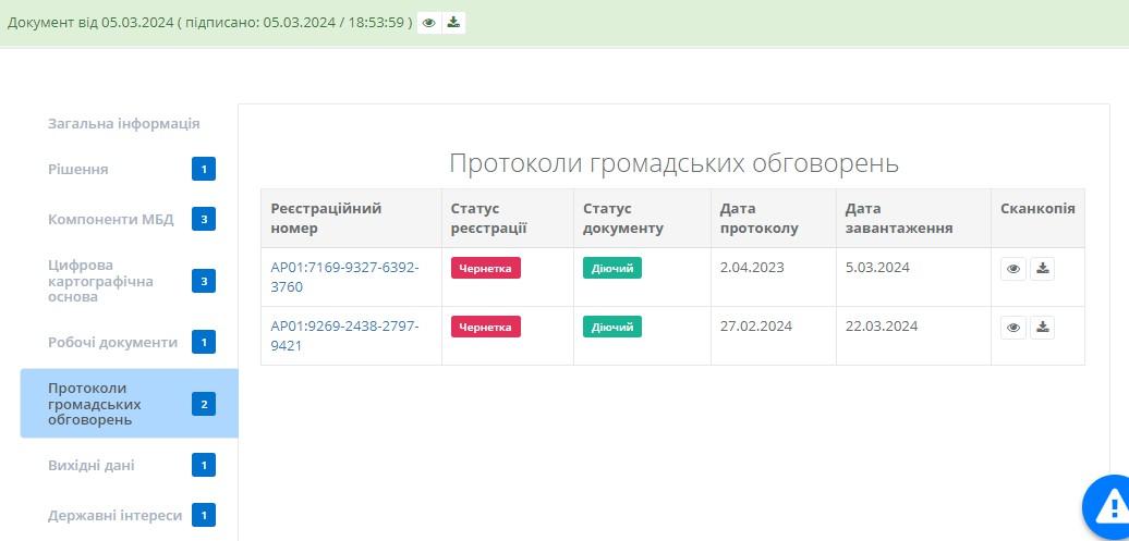 В цій таблиці користувач може переглянути або завантажити протоколи громадських обговорень натиснувши на відповідні кнопки та