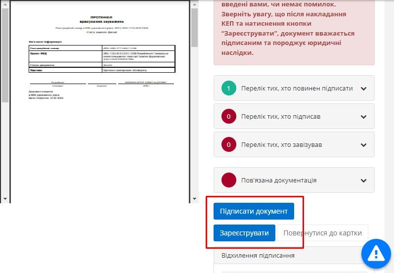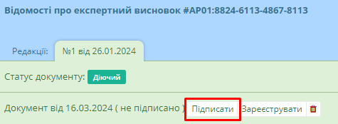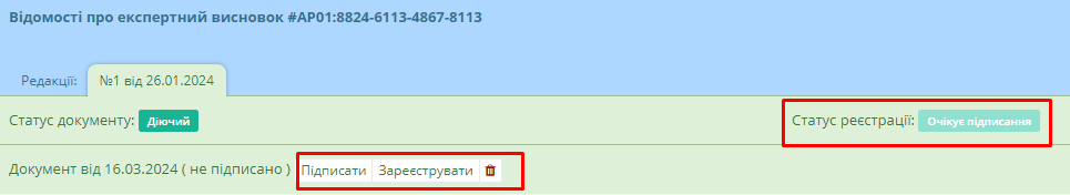 Після цього документ отримає статус “Очікує підписання” та водночас користувачу стануть доступні кнопки підписання та реєстрації документу (Рисунок 43):