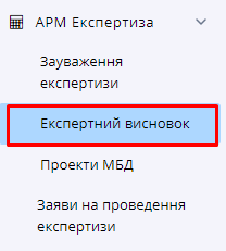 Для внесення відомостей про експертний висновок користувачу необхідно перейти до електронного кабінету Експертизи містобудівної документації та у ньому перейти до розділу під назвою “Експертний висновок”. Меню має наступний вигляд (Рисунок 31):