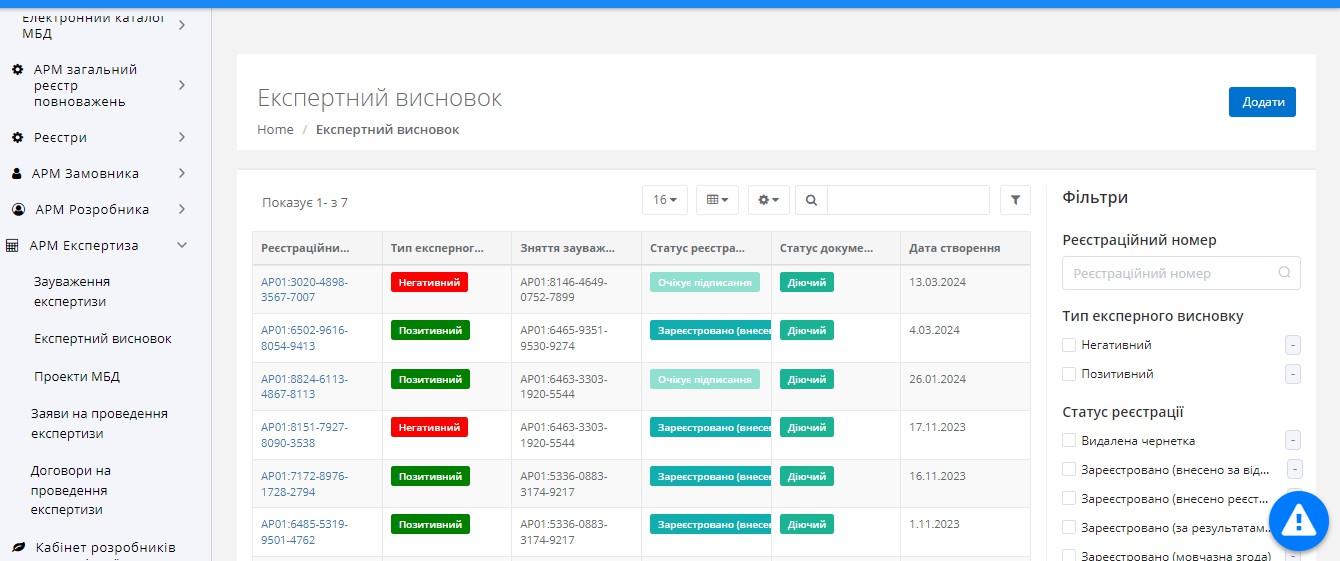 Після переходу до реєстру користувачу буде доступна табличка із експертними висновками. Таблиця реєстру має наступний вигляд (Рисунок 32)