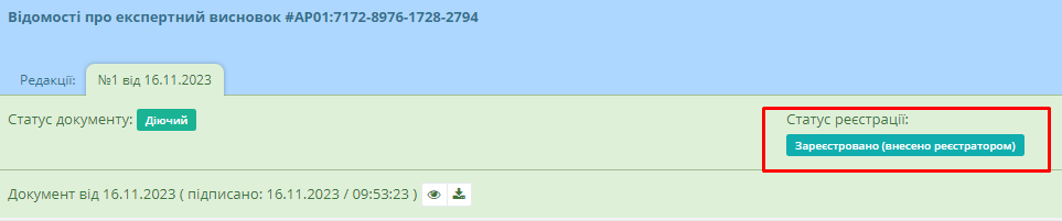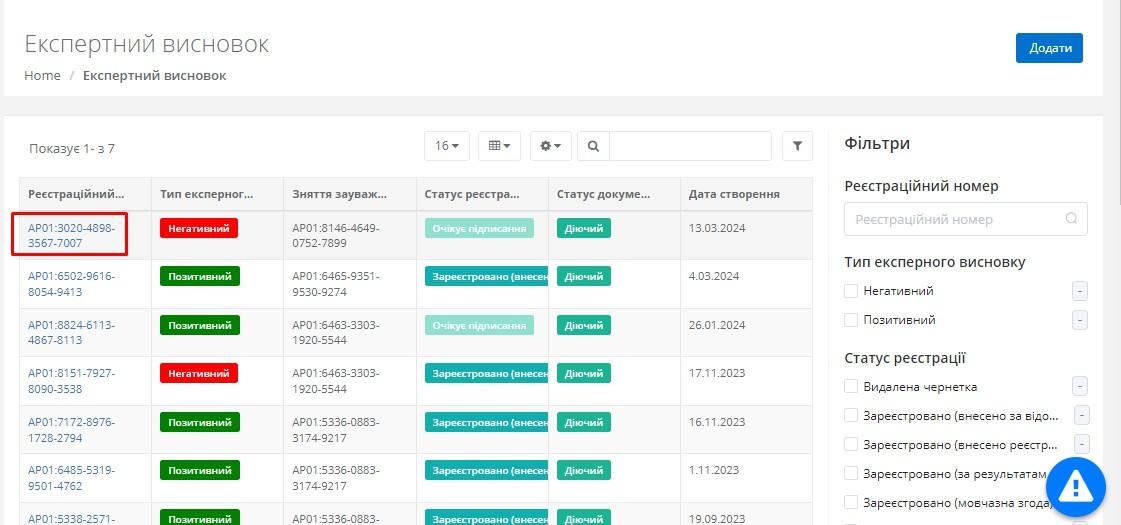 Після створення документу та натиснення кнопки “Зберегти”, система автоматично перемістить користувача в реєстр створених експертних висновків. Знайшовши необхідний висновок, користувач має перейти до його картки.