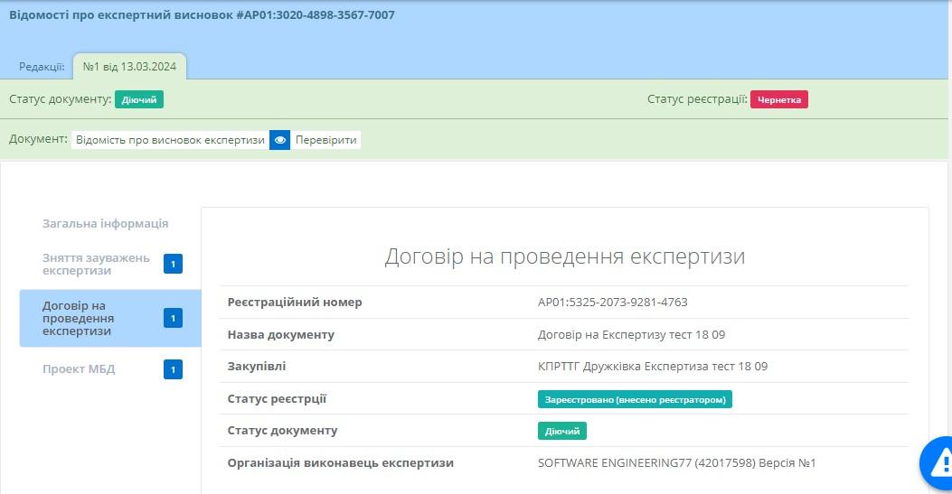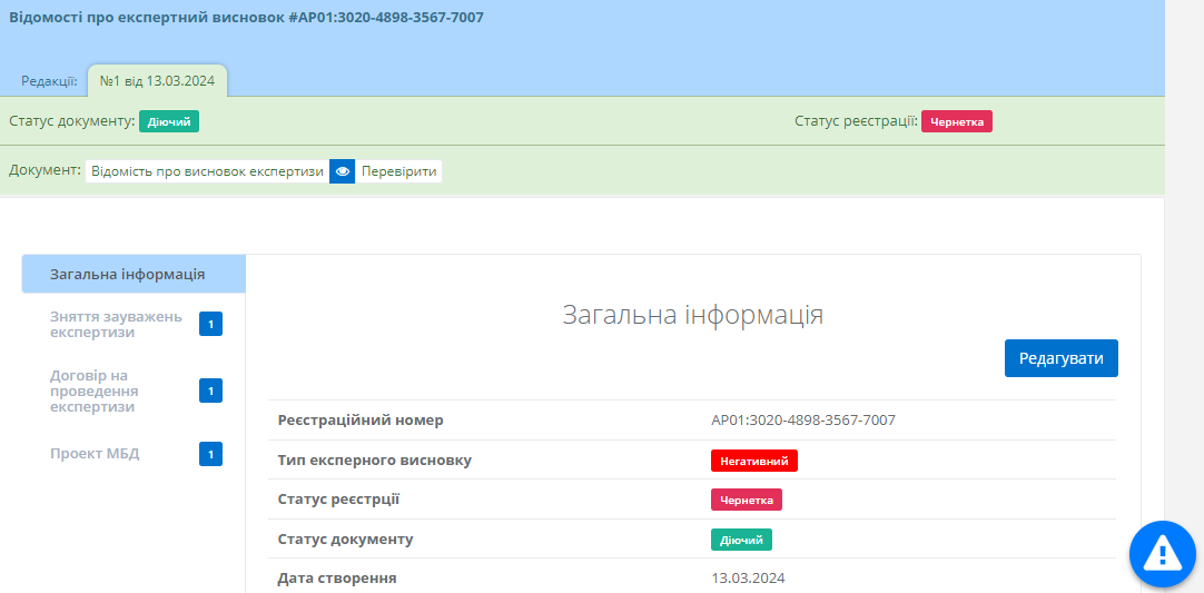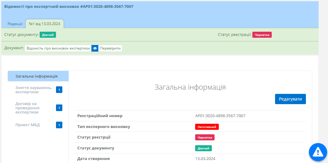 Картка експертного висновку виглядає подібним чином (Рисунок 35), загальну інформацію також можна редагувати натиснувши на однойменну кнопку у верхній частині картки.