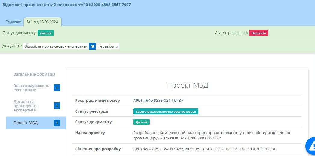 За потреби користувач може перейти до картки проекту МБД, натиснувши на його реєстраційний номер який виділений синім.